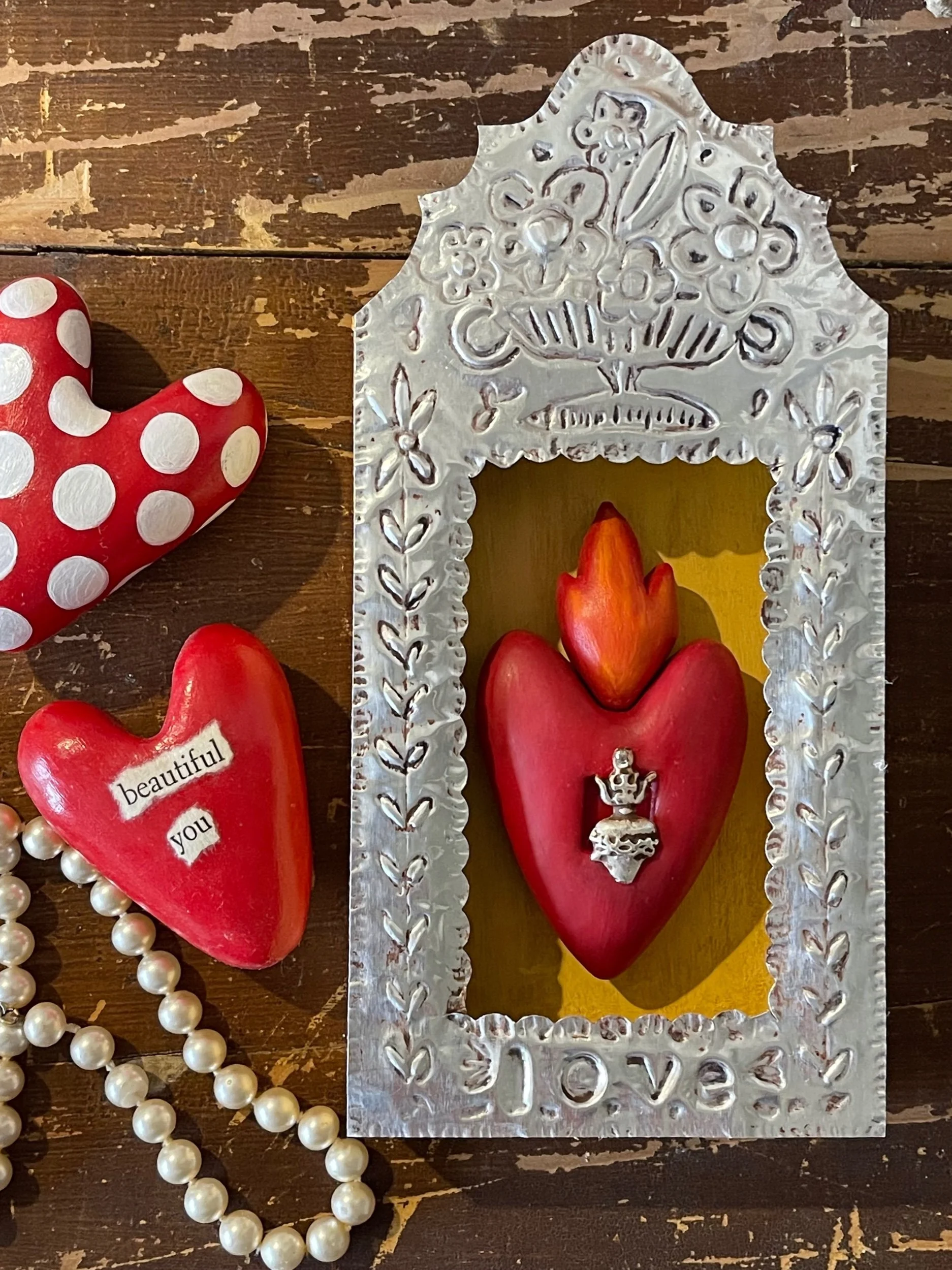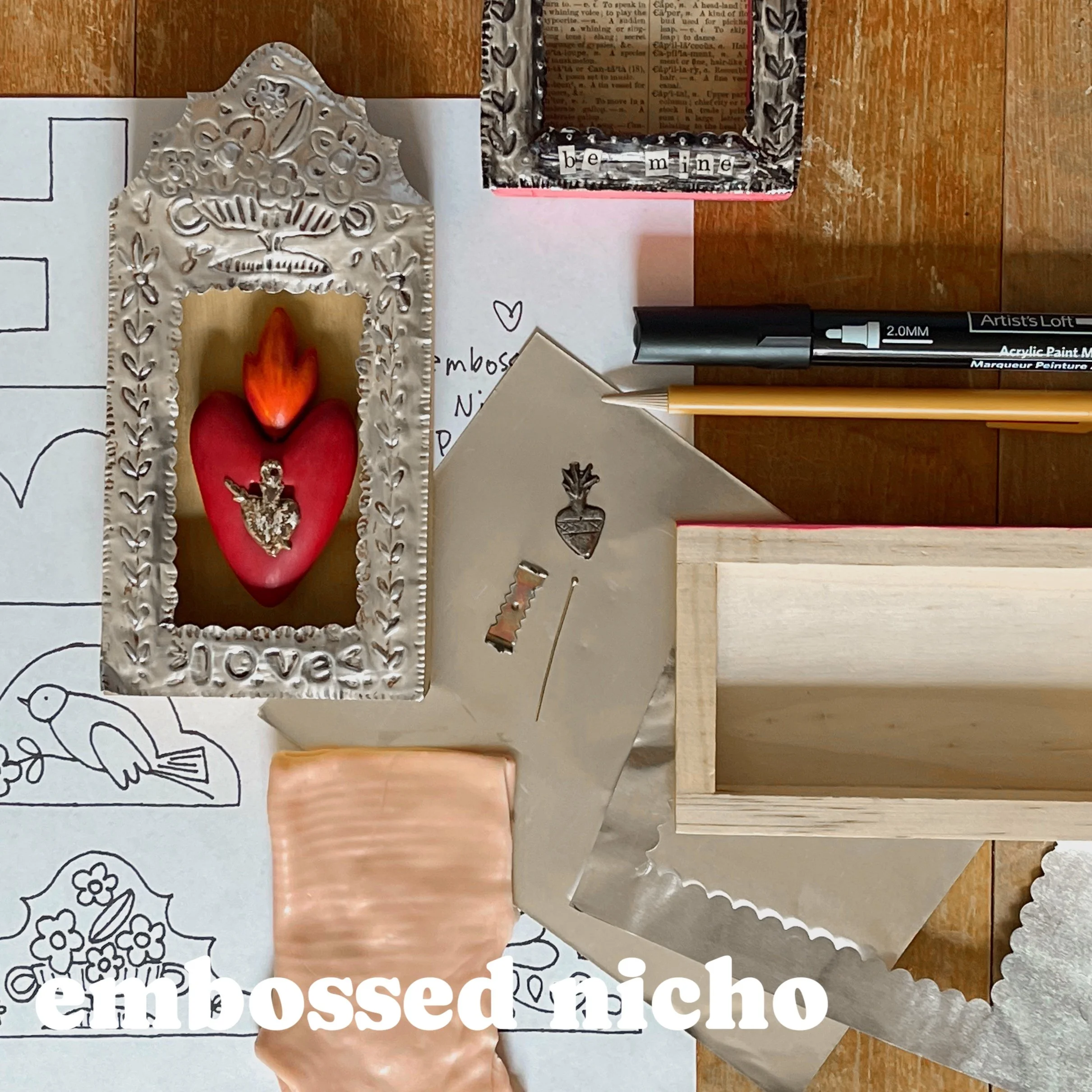 i’ll teach you how to sculpt a clay sacred heart from polymer clay and make an embossed tin frame for your very own nicho! a nicho is a form of mexican folk art and uses a shadowbox to display a cherished item or memory. i have taught this class several times in the last few years (since 2019) and it’s always been a crowd favorite. you will be so delighted with your finished piece! (have a peek at all the photos to see some amazing student work)